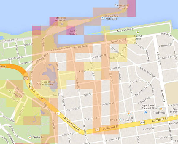 Due to the large number of students, we spread the workshop out over multiple days which allowed us to compare air quality measurements from one day to the next. We were happy to find that the AirCasting data followed the same pattern observed in the official monitoring data posted to AirNow.gov. On the April 16th the AirCasting CrowdMap is predominantly orange with scattered red and yellow whereas on the 17th it is predominantly yellow with scattered green. The official Air Quality Index from these same days indicated that PM2.5 concentrations in the Bay Area were indeed higher on the 16th, 55/yellow, than the 17th, 45/green.